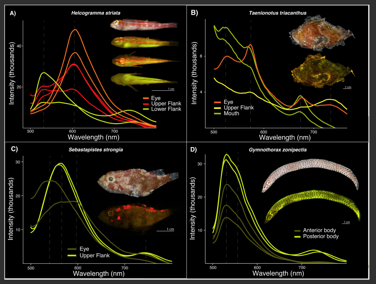 [Image: Fig 5. Variation in fluorescent emission spectra, or lack thereof, over different regions of the body in individuals. A) Helcogramma striata (Tripterygiidae, n = 1); B) Taenianotus triacanthus (Scorpaenidae, n = 1); C) Sebastapistes strongia (Scorpaenidae, n = 1); D) Gymnothorax zonipectis (Muraenidae, n = 2). Note: For each panel the top image shows the species imaged under white light and all others show the species fluorescing. Dashed lines represent fluorescent emission peaks. Intensity values are relative and do not signify overall brightness]
